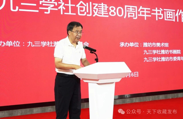 劉世海代表濰坊市文聯(lián)向本次書畫展的成功舉辦表示祝賀。他指出此次書畫展不僅是對九三學(xué)社80年光輝歷程的深情回望,更是對其崇高精神的生動詮釋與薪火相傳,展現(xiàn)了九三學(xué)社社員及所聯(lián)系知識分子深厚的文化素養(yǎng)、家國情懷與時代擔(dān)當(dāng)。要以此次展覽為契機(jī),進(jìn)一步加強(qiáng)交流、深化合作,共同用文藝的力量凝聚人心、匯聚力量,用優(yōu)秀的文藝作品描繪新時代、唱響主旋律,為加快建設(shè)人民滿意的現(xiàn)代化品質(zhì)城市貢獻(xiàn)更多文藝力量。