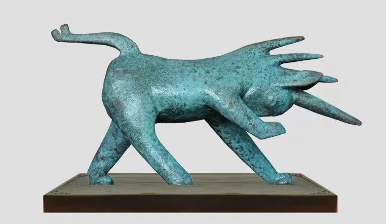 獬豸是中國古代傳說中的一種似羊非羊、似牛非牛的神獸,具有分辨是非、判斷正誤的特異功能。該作品三腳踏地,低首翹尾,銳角前凸,躍躍欲試,除頭頂部的主角之外,又將頸背部的鬃毛化作三只尖角,兩只長耳亦前刺如矛,突出了獬豸無所畏懼,集全身之力向邪惡沖刺的耿直本性。